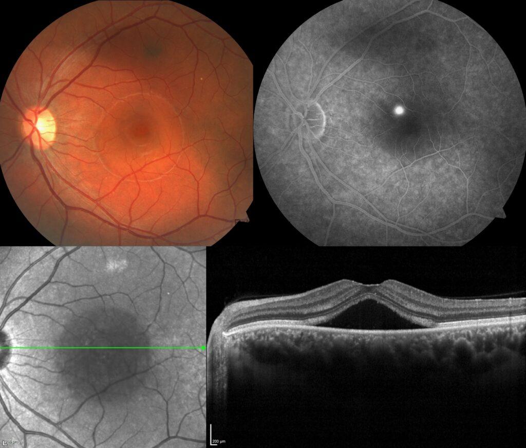 According to these multimodal imaging characteristics, the patient was diagnosed with central serous chorioretinopathy and informed that his visual changes were likely to improve without intervention.