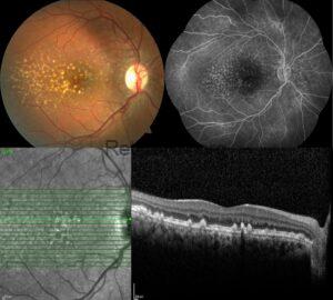 This Fundus Photo and OCT show preretinal hemorrhage due to a retinal arterial macroaneurysm rupture. [...]