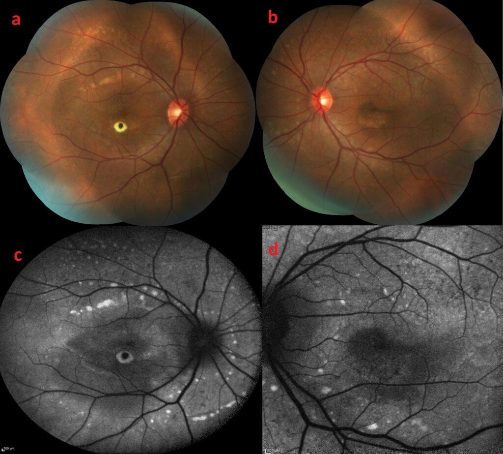 Dilated fundus examination demonstrated centrally hyperpigmented macular scar in the right eye and focal hypopigmented RPE atrophy at the inferior of fovea in the left eye in addition to bilateral multifocal subretinal white-yellow deposits in the macula and posterior pole of both eyes.