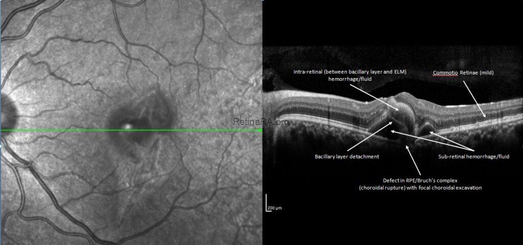 The spectral domain optical coherence tomography (OCT) imaging revealed defective retina pigment epithelium-Bruch’s membrane complex with a focal choroidal excavation, mild commotio retina, cystic subretinal hemorrhage areas, bacillary layer detachment and intraretinal hemorrhages that located between bacillary layer and external limiting membrane.