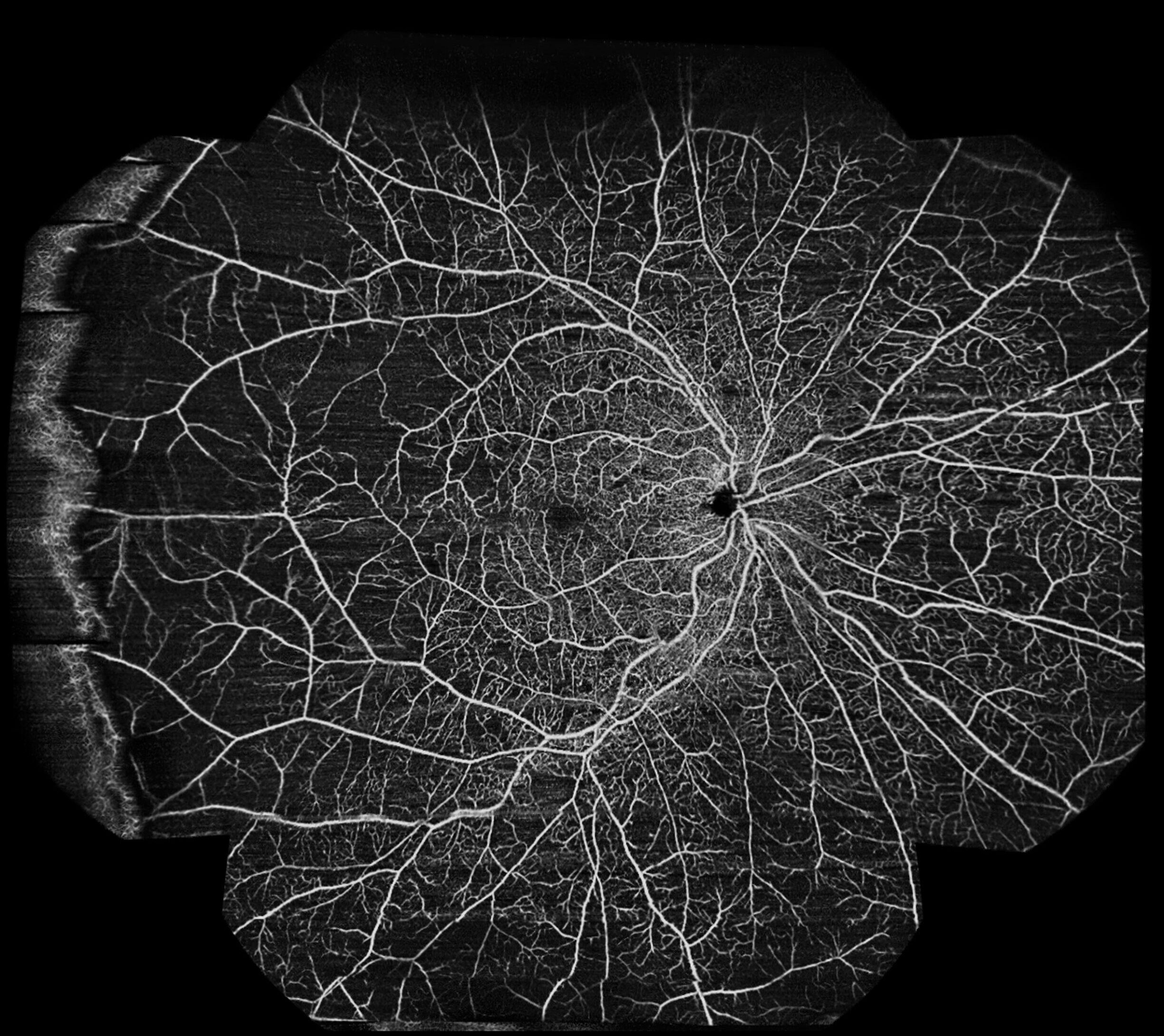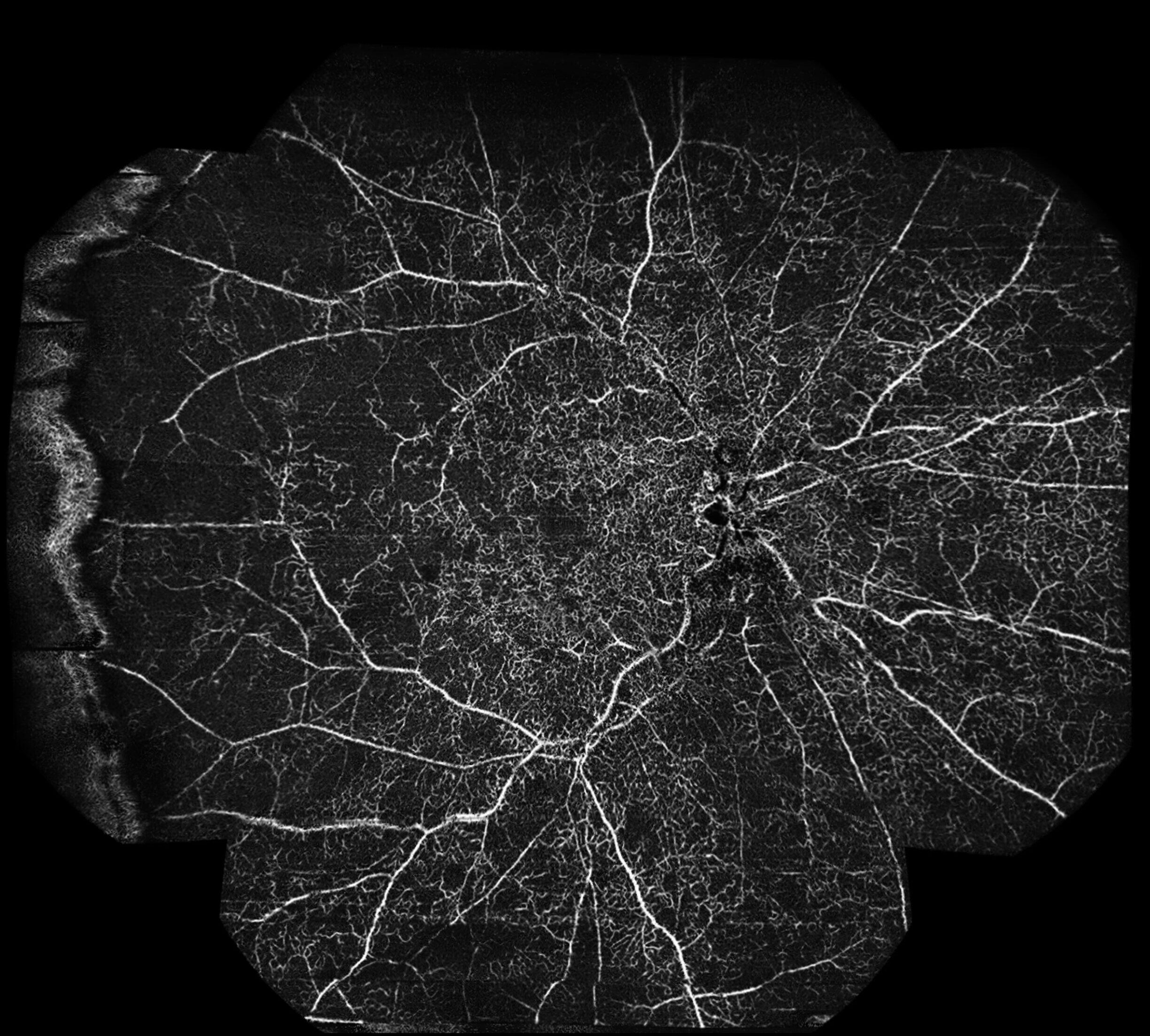 The ultra-widefield OCTA image provides an extended view of the retinal vasculature beyond the posterior pole. In the post-treatment scan, the superficial vascular plexus (top image) demonstrates improved perfusion centrally, although extensive areas of capillary nonperfusion are still evident in the midperiphery and periphery. The deep plexus (second one) reveals more pronounced dropout, with diffuse hypoperfused zones reflecting irreversible ischemic damage. Overall, the ultra-widefield OCTA highlights the persistent peripheral ischemia in spite of treatment, underlining the value of widefield imaging in assessing the full extent of vascular compromise in central retinal vein occlusion.