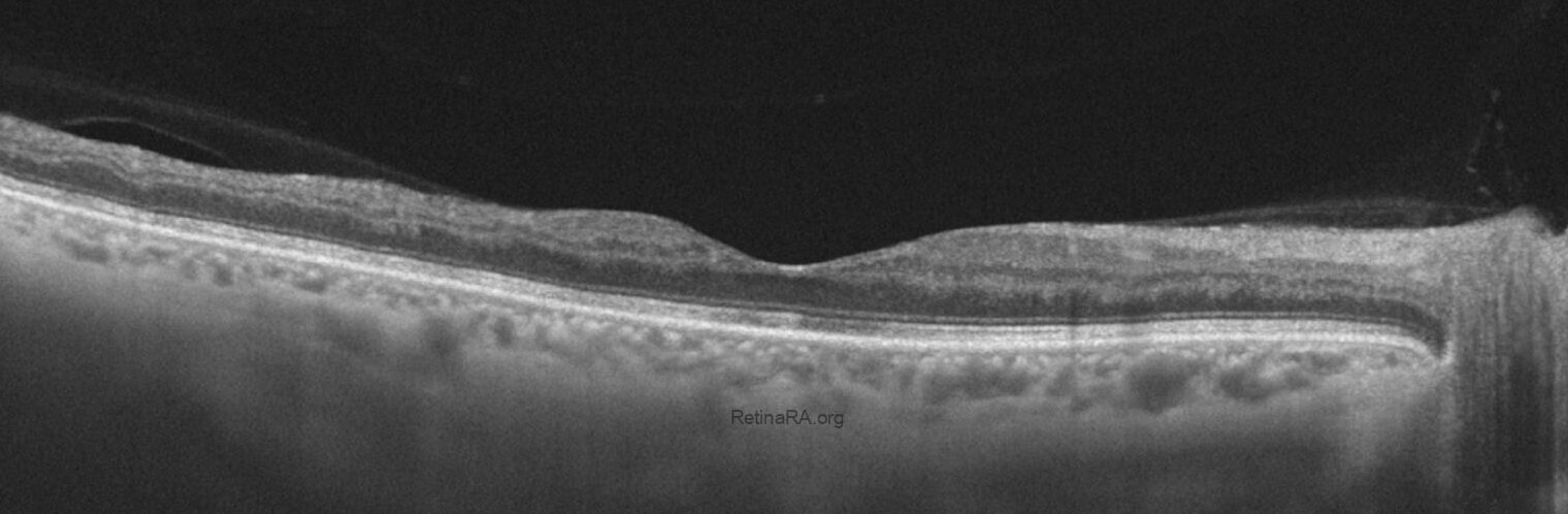 The post-treatment OCT image demonstrates a marked reduction in macular edema with restoration of the foveal contour and resolution of intraretinal cystoid spaces. The outer retinal layers appear more distinct, and overall retinal thickness has normalized compared to baseline. Notably, there is thinning in the temporal macular region, likely reflecting atrophic changes secondary to chronic ischemia and prior edema. These findings indicate a favorable anatomical response to anti-VEGF therapy, while also highlighting residual structural damage in the temporal retina.