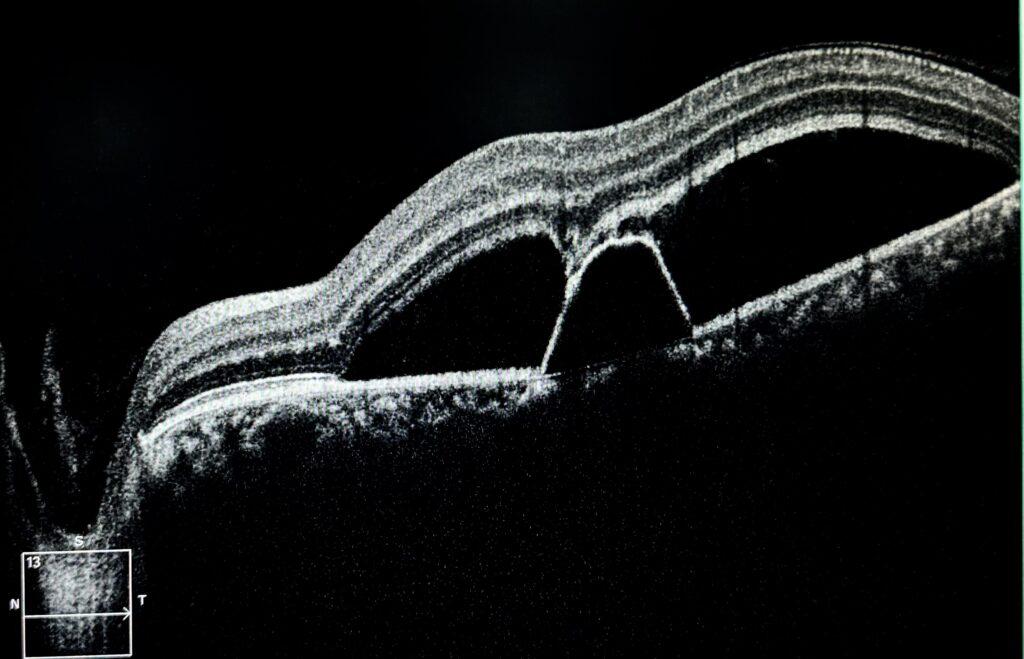 A 23-year-old male patient with central serous chorioretinopathy with large pigment epithelial detachment (PED) and subretinal fluid (SRF) were seen on OCT and was kept on conservative management with lifestyle modification. His vision on presentation was 6/24. On his 1.5 months follow-up examination, his vision had improved to 6/9, and OCT shows regressed PED with no SRF.