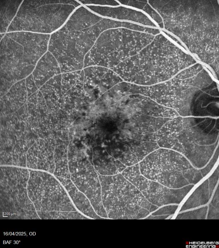 In the absence of other age-related macular degeneration (AMD) features, such presentations suggest adult-onset foveomacular dystrophy (AOFD).