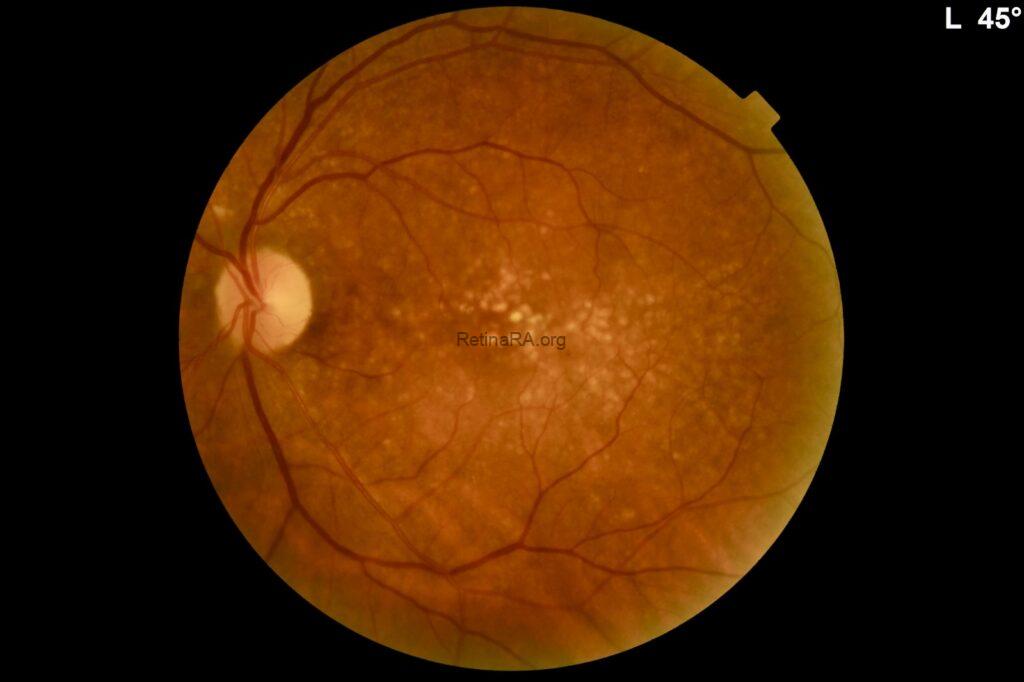 Color fundus photography revealed widespread, yellowish dense deposits involving the macula and extending beyond the macular region in both eyes.
