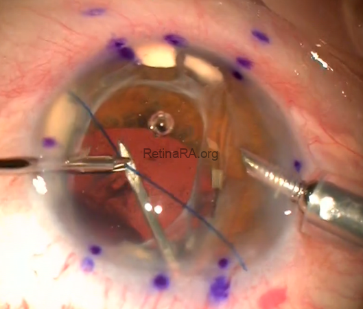The preoperative visual acuity of the case was 0.05 decimal. The surgeon chose to use the Four-Flanged technique to fix the subluxated four-haptic IOL to the sclera. He used a 27-gauge insulin needle tip and 6.0 Prolene sutures.
