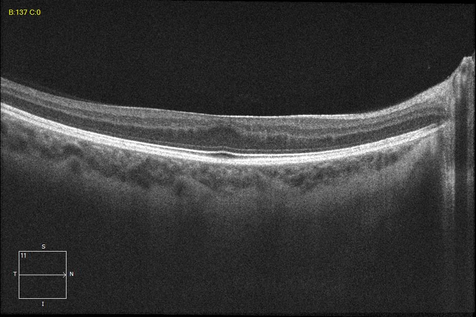 In contrast to other definitions, Thomas et al. defined foveal hypoplasia as the persistence of inner retinal layers in the fovea and developed a grading system based on optical coherence tomography features. According to this grading system, grades 2, 3, and 4 of foveal hypoplasia corresponded to the fovea plana.