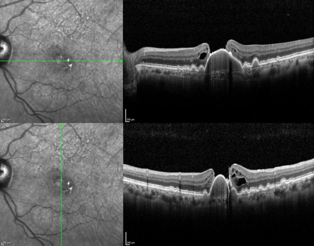 The horizontal and vertical optical coherence tomography scans passed through the central fovea revealed sub-RPE deposits, a large drusenoid pigment epithelial detachment combined with full-thickness macular hole with a detached posterior hyaloid.