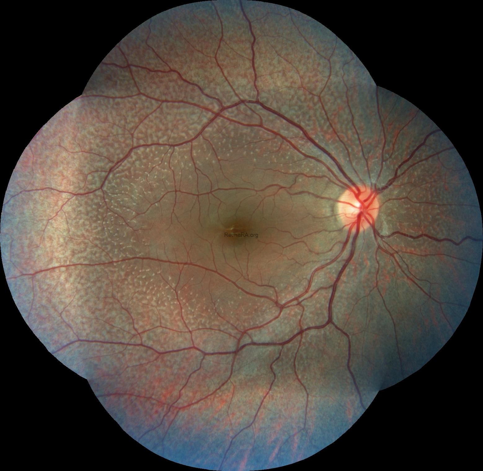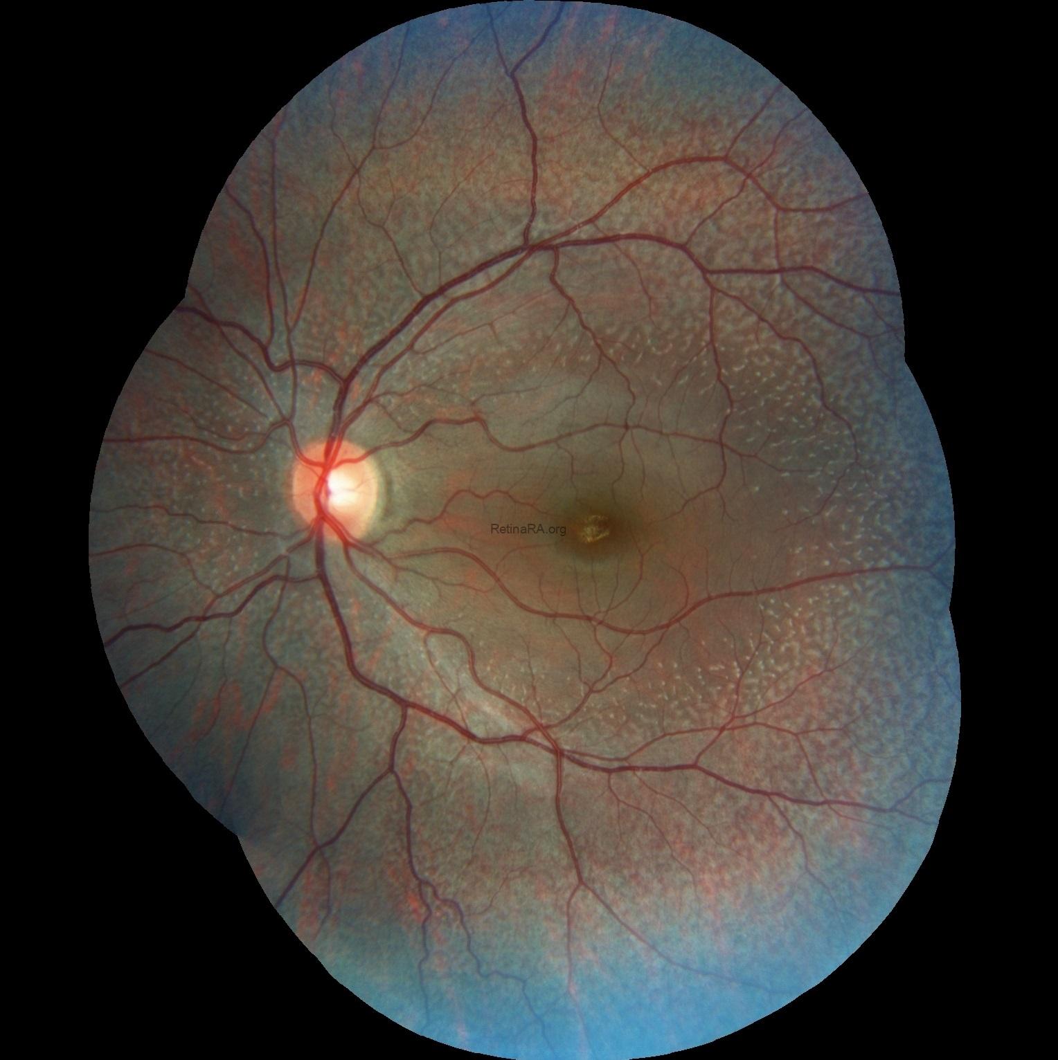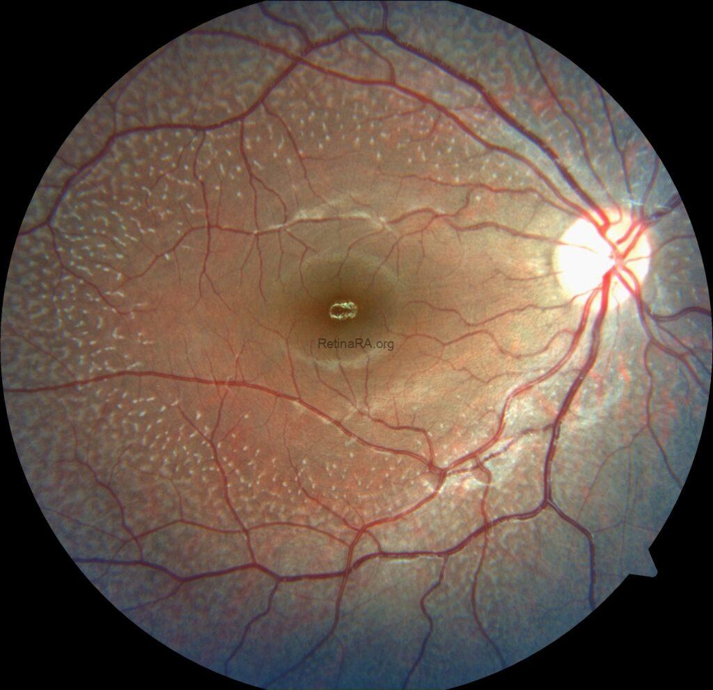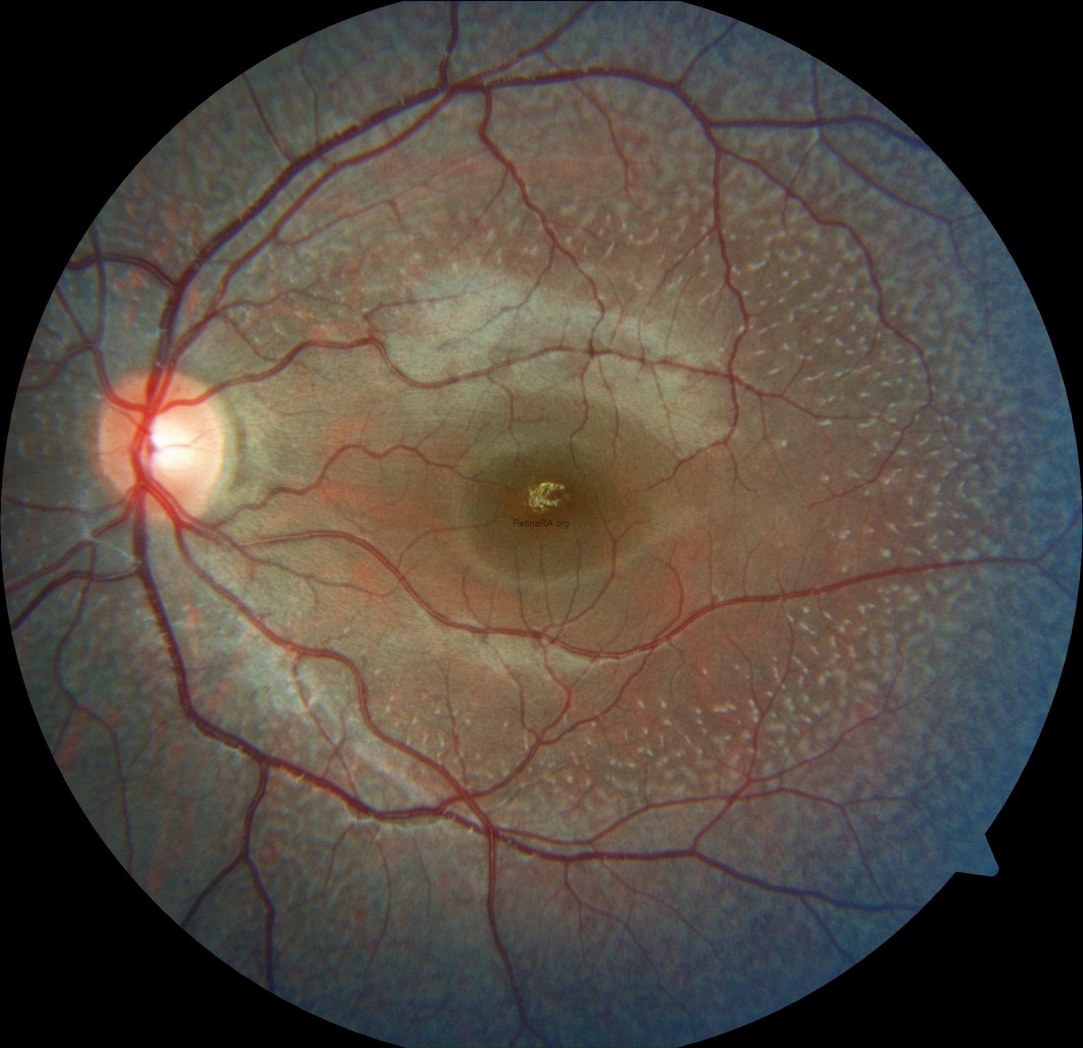 Ophthalmoscopic examination reveals scattered, discrete yellowish-white dots at the level of the retinal pigment epithelium, predominantly outside the macula. While these lesions are generally stable over time, partial regression has been documented in long-term follow-up. Histopathologically and functionally, these deposits are thought to represent accumulated retinoid intermediates, extending from the RPE–Bruch membrane complex into the outer retinal layers, including the outer nuclear layer.