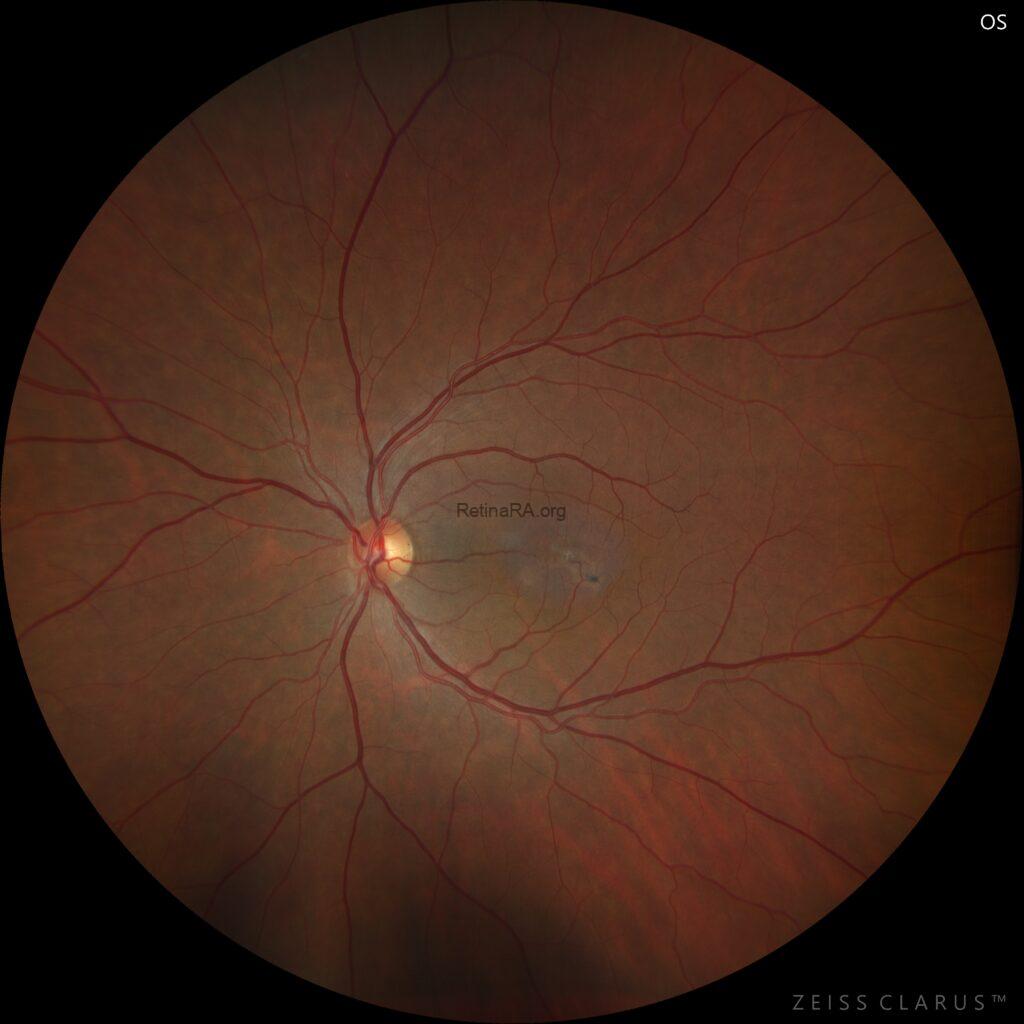 Fundus examination revealed subtle bilateral parafoveal loss of retinal transparency associated with small pigment clumps and right-angled venules in both eyes.