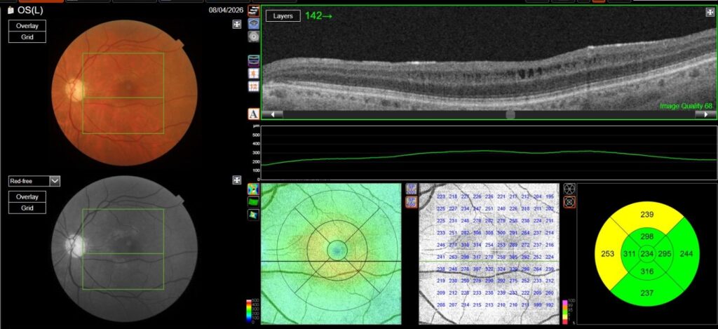 Based on patient history, clinical examination and multimodal imaging, a diagnosis of Microcystic Macular Edema (MME) secondary to Optic Neuropathy was made.