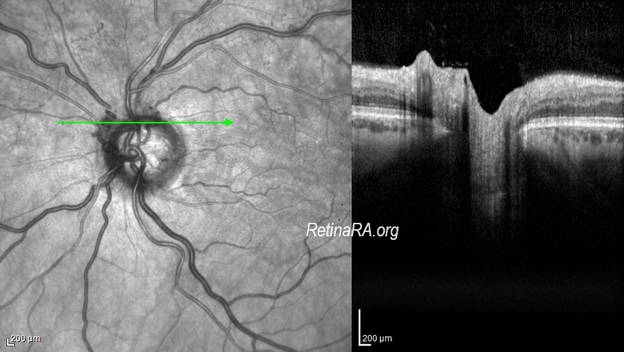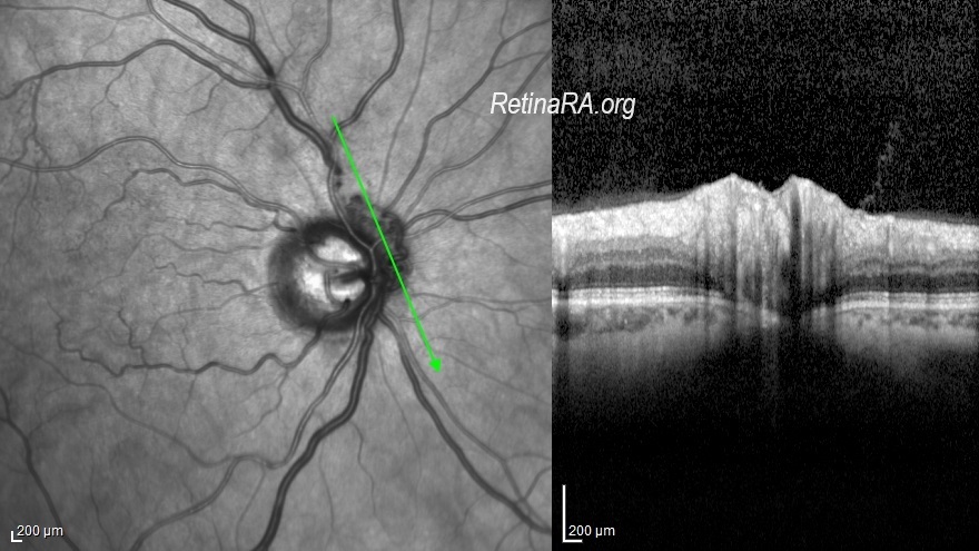 Optociliary shunt vessels are diagnosed on ophthalmic fundus examination, appearing as tortuous vascular loops that begin and end on the disc. Flow within these shunts can be documented in indocyanine green angiography, during the venous phase of fluorescein angiography, or with optical coherence tomography angiography. They must be distinguished from disc neovascularization since neovascularization requires prompt laser photocoagulation whereas shunt vessels can protect against retinal ischemia. Optociliary shunt vessels are generally appear loopy and thick and do not cause leakage on fluorescein angiography.