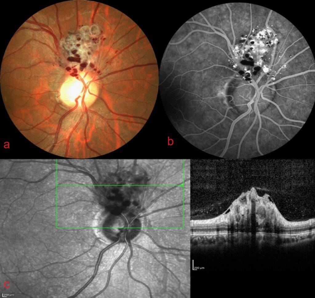 A 49-year-old female was referred to the retina clinic because of a peripapillary vascular tumor which was detected during routine eye examination. Fundus examination showed peripapillary grape-like clusters of red and dilated sac-like aneurysms filled with dark red blood.