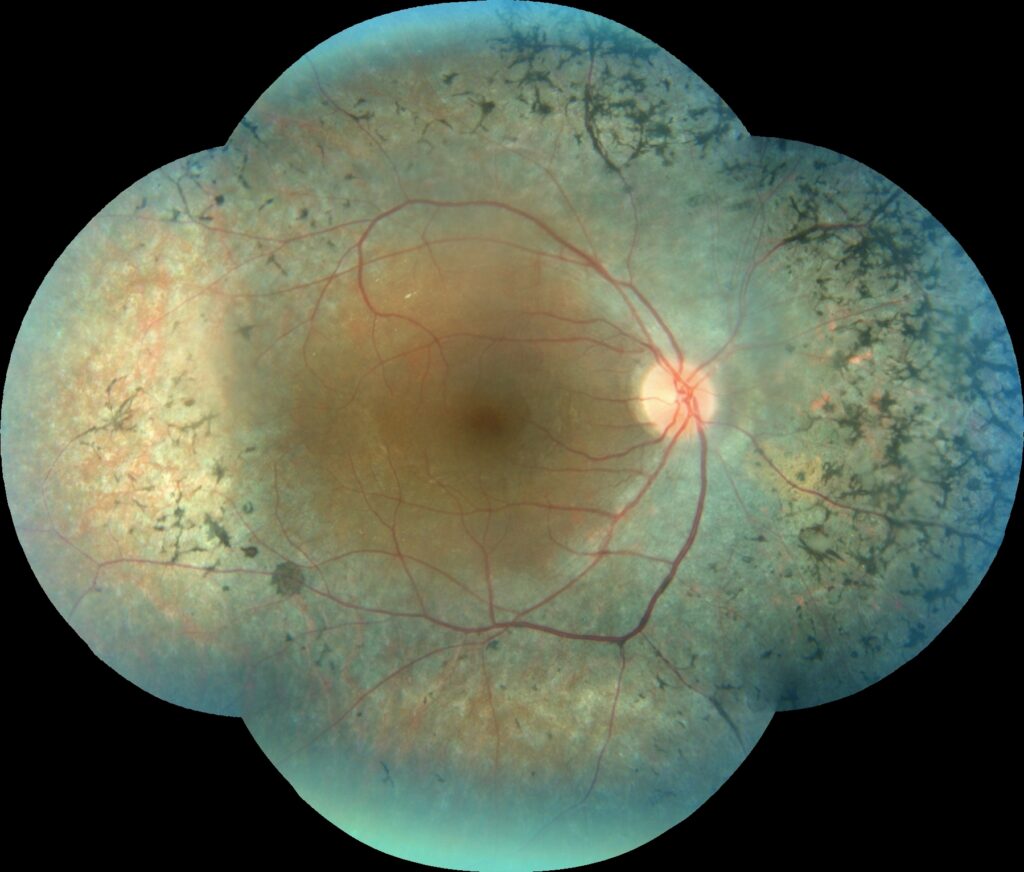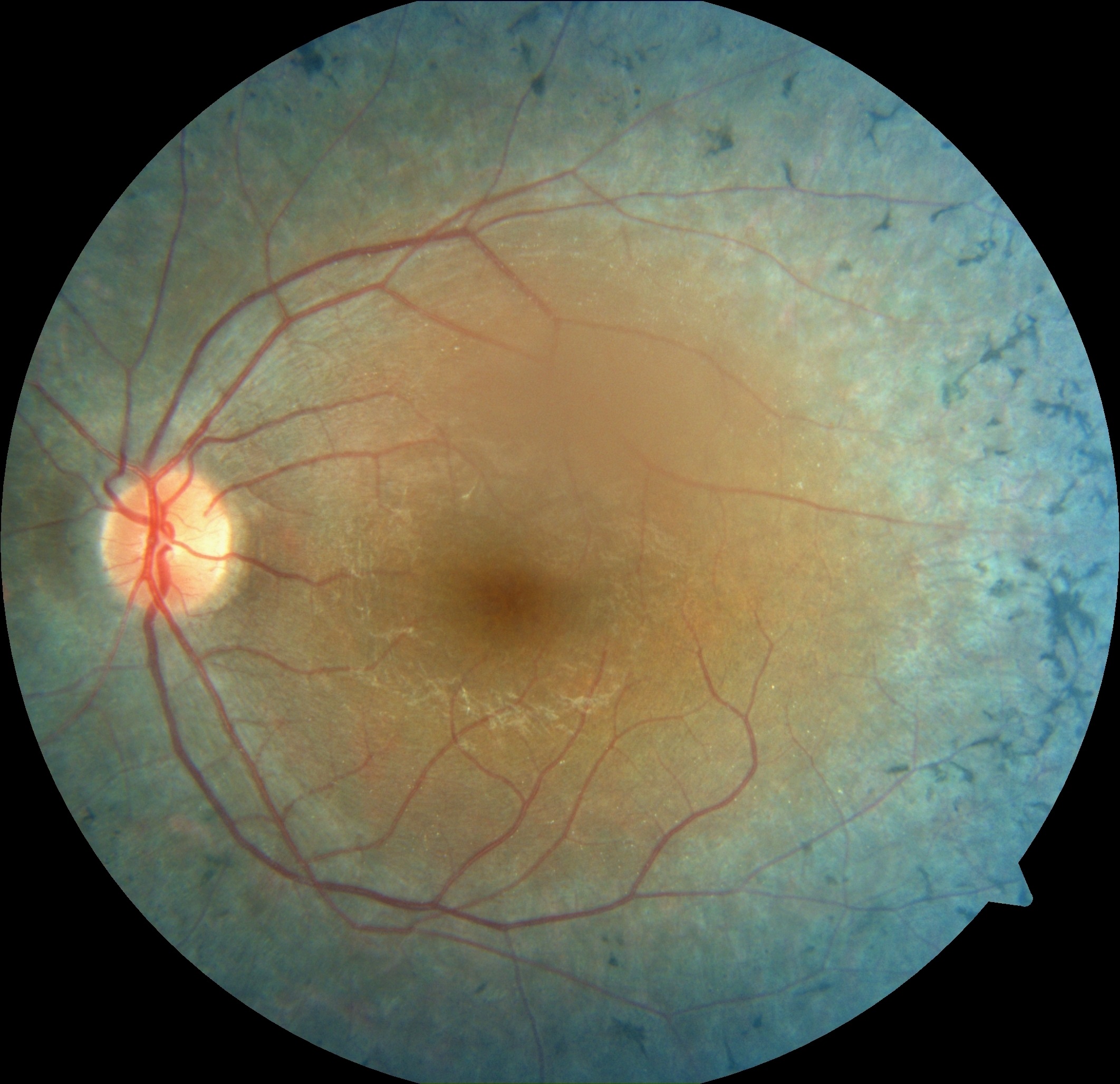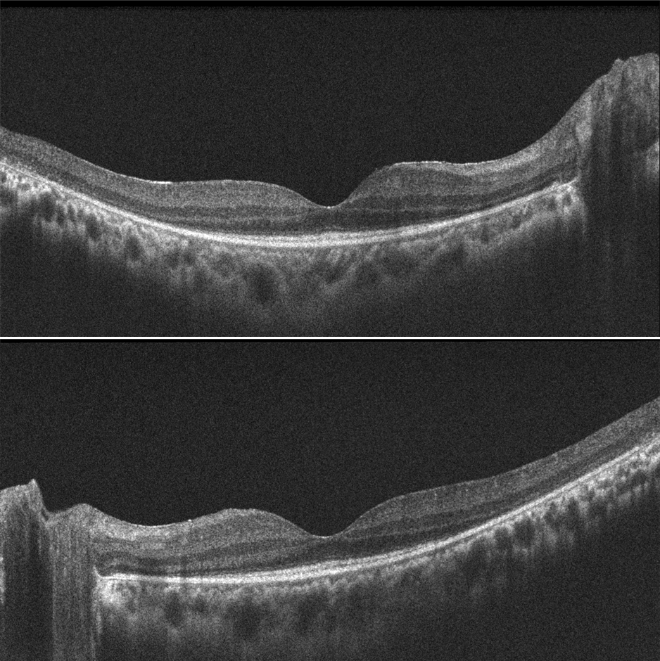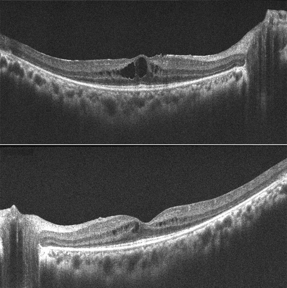 A 26-year-old female patient with cystoid macular edema (CME) secondary to retinitis pigmentosa (RP). Pretreatment OCTs show CME bilaterally. After one month of topical Brinzolamide treatment, visual acuity improved from 20/50 to 20/30 and CME resolved bilaterally.