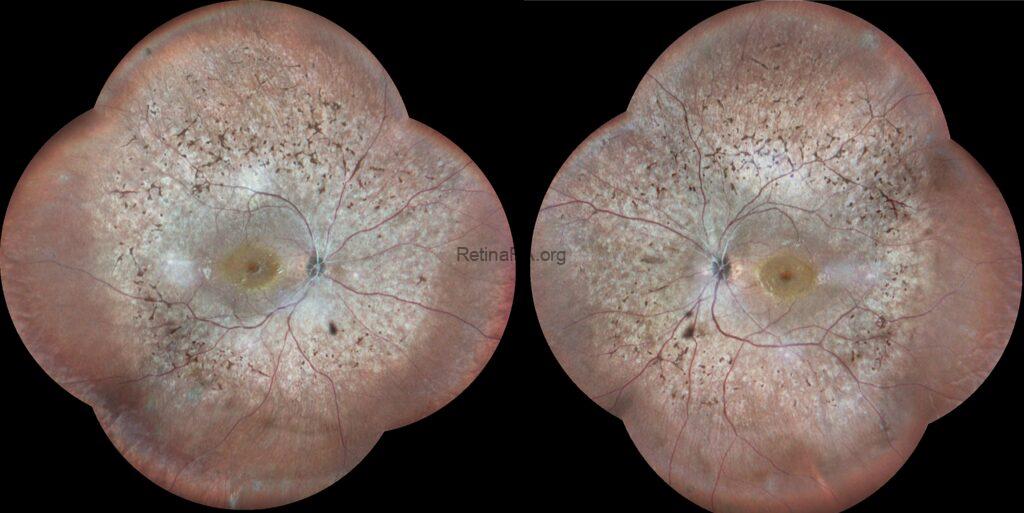 This was a 30-year-old female suffering from decreased vision and impairment of night vision and loss of peripheral vision. The BCVAs were 20/200 for both eyes, and IOPs were within normal limits. Biomicroscopic evaluation revealed a mild posterior subcapsular cataract.