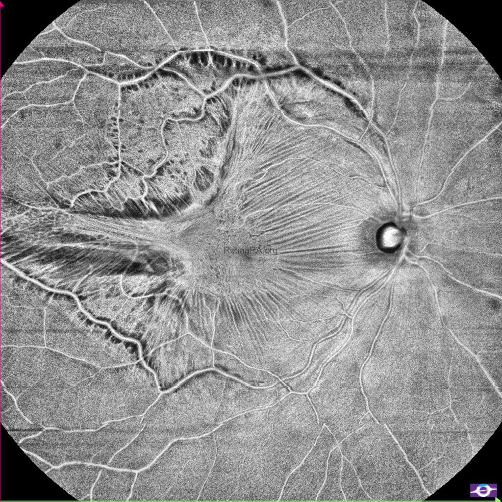 As seen in the color fundus photograph, there was significant tangential macular traction, particularly at the temporal side. Enface OCT demonstrated this remarkably well. It clearly showed the contraction of the epiretinal membrane, distortion of the retina, and traction-related retinal damage.