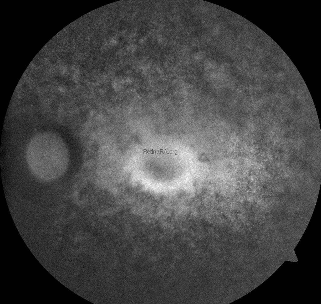 On fundus autofluorescence imaging, the patient exhibited a parafoveal hyperautofluorescent ring, delineating the border between relatively preserved and degenerated photoreceptor regions. Beyond this ring, patchy hypoautofluorescent areas were observed in the midperipheral retina, consistent with widespread retinal pigment epithelium and photoreceptor loss. These findings are characteristic of retinitis pigmentosa.